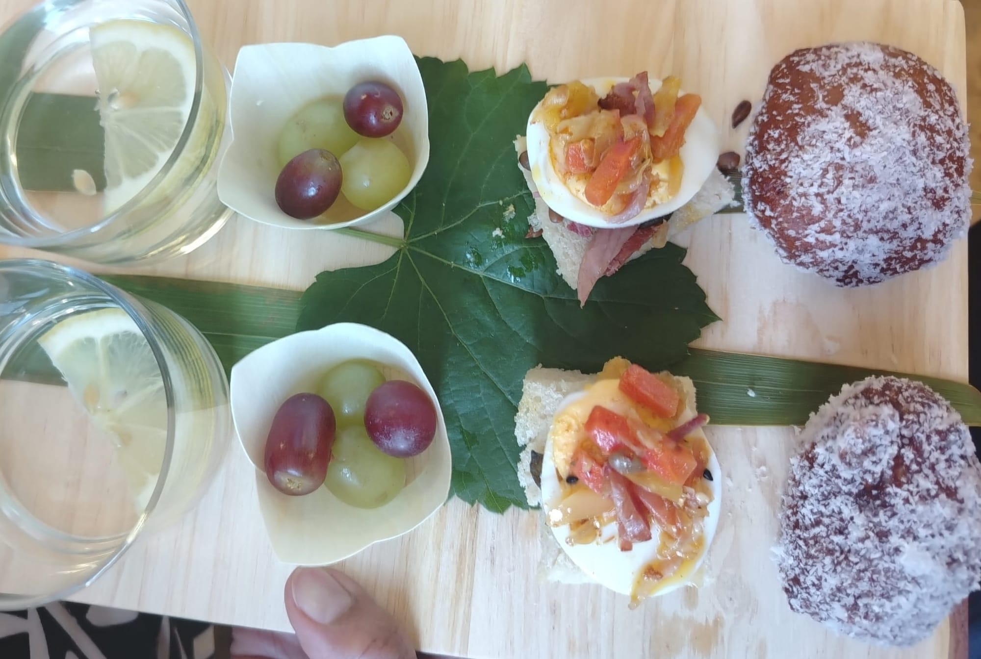 Our second course reflected all these upheavals. Our snack board contained a glass of lemon water, as Vitamin C rich lemons had become an important horticultural product, valued especially for keeping scurvy at bay during long sea voyages. We were also given grapes, and a deviled egg, topped with traditional atchar, a spiced relish of different pickled fruits and vegetables. The last item was a traditional Malay spiced pastry called koesister, soaked in syrup and dusted in coconut flakes.