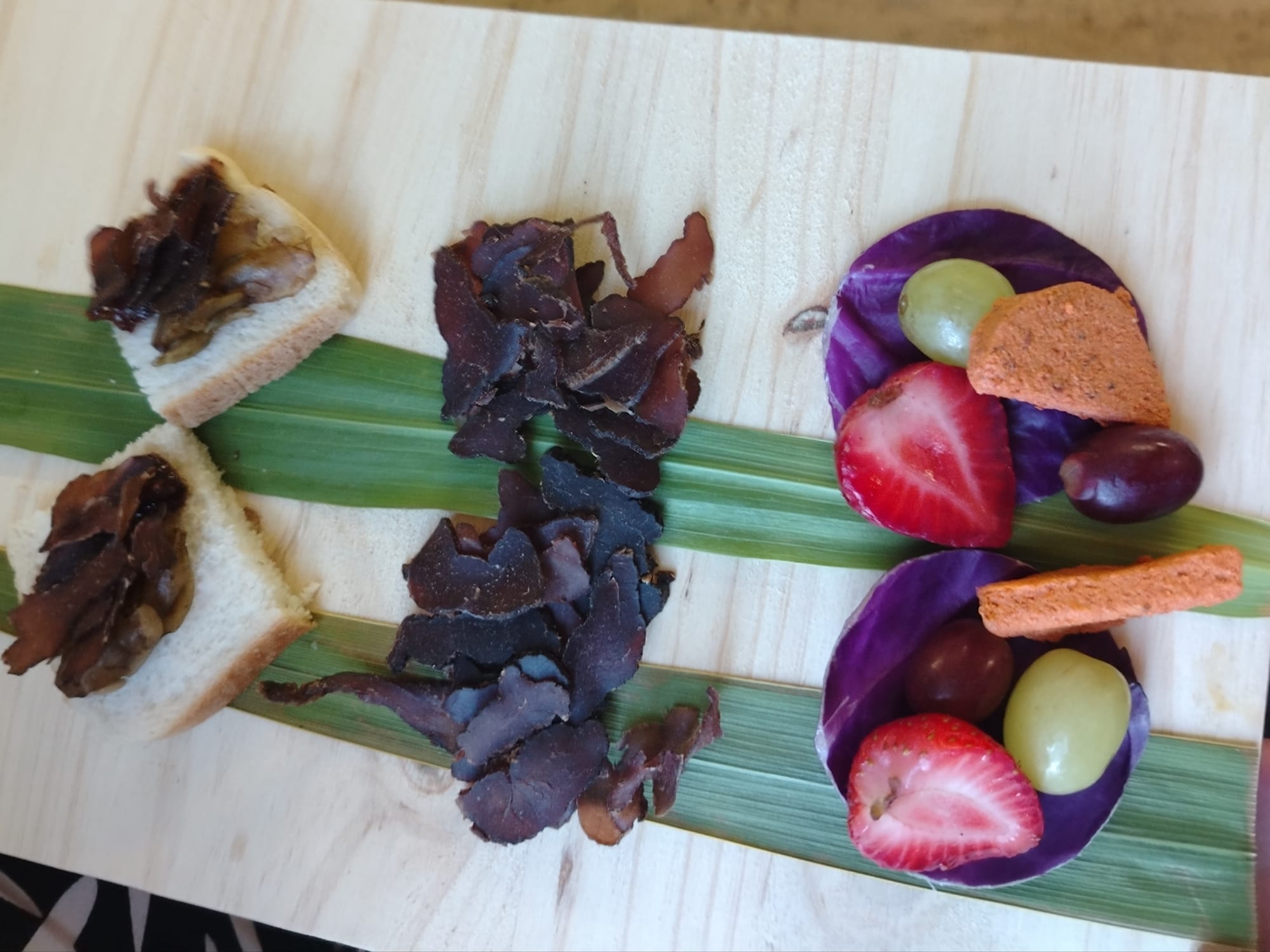 Our snack board of the current day reflected these fraught global and local dynamics. We were served cheap industrially processed white bread, dried beef biltong sweetened with fig jam, and grapes and strawberries on a cabbage leaf with a little pate of dried fruit called "meebos."
