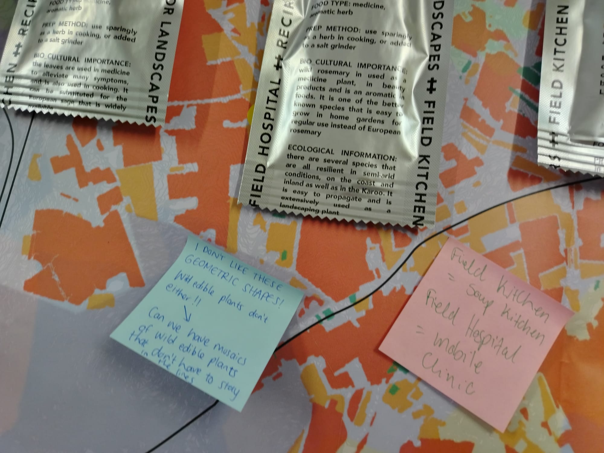 In order to "see" the long arc of this trajectory, our group was invited to take a "walk through time," to peruse each of the four maps representing the different eras, laid out on different tables arranged in the formation of a medical cross. On each table, foods typical of the era were also laid out on top of the landscape maps, sealed in foil packets to represent the aesthetics of the disaster zone.