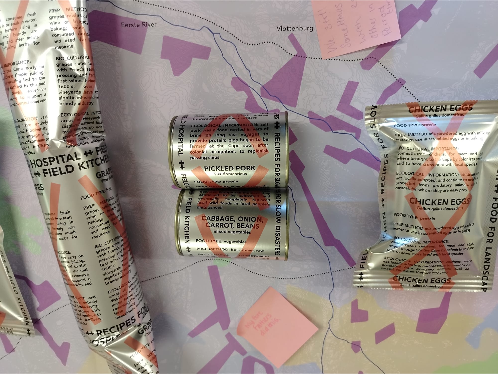 The predominance of red X's on the food packets of the present day table spoke powerfully to value systems we all are forced to navigate. Somebody remarked on how intensively strawberries are now grown in Lynedoch Valley, in linear fields covered in plastic sheeting. Yet at the same time, many of us could not deny that we enjoy our wine and our strawberries, even knowing the ecological and social harm that they cause. Through the lens of the present day, we were faced with our own complicity in the slow disaster.