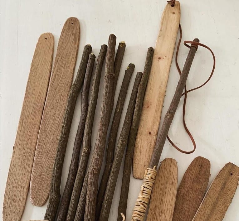 A bullroarer is an ancient vibroacoustic device, or aerophone — one of the earliest known musical instruments. It is composed of a piece of wood or bone, rounded at the ends and attached to a string or a cord. When it is swung around the head in a circle, it produces an intense, vibrating hum that sounds like a giant swarm of bees. As Rusch related, the /Xam people would very likely once have used their !goin !goin instruments to direct swarming bees to new hive locations that would be easy for them to access — a striking example of interspecies communication and empathy.